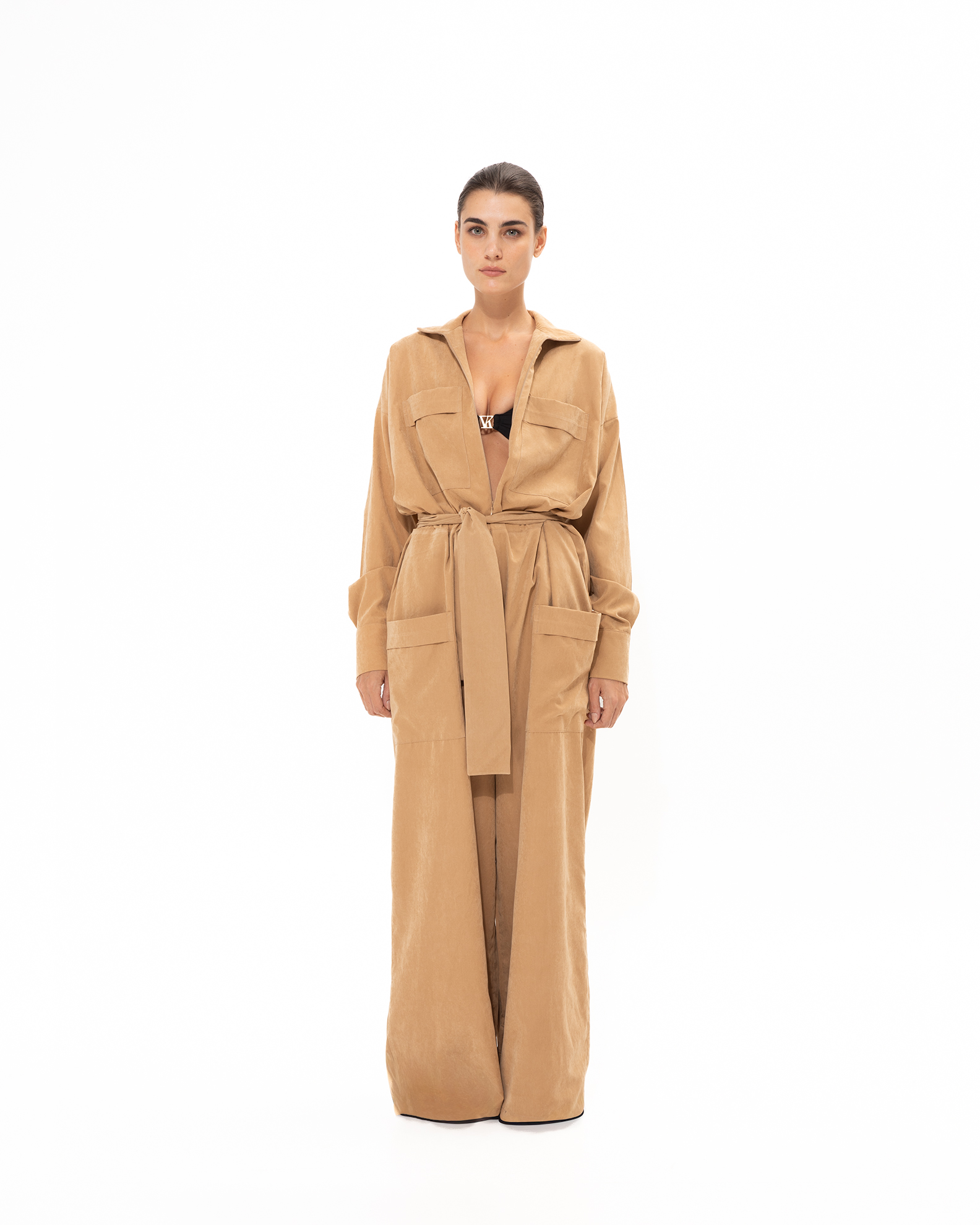A chic camel playsuit with a cinched waist and utility pockets for an effortlessly elegant silhouette.