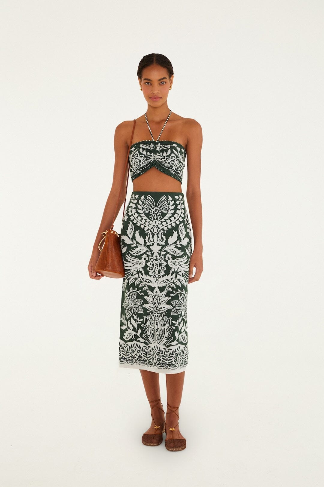 Embrace effortless style with the Dark Green Miranda Knit Skirt from FARM Rio. This piece features a rich, deep green hue inspired by Brazil’s lush landscapes, crafted in a soft, ribbed knit that gently hugs your silhouette. Its graceful A-line cut flows naturally, while subtle textured patterns add depth and character. Perfectly balancing comfort and charm, this skirt brings warmth and playful elegance to every step you take.